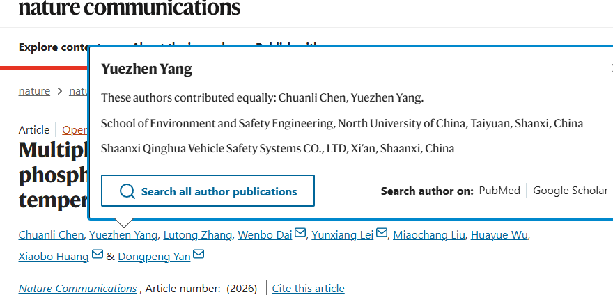 此项成果由我校联合北方特种能源集团陕西庆华汽车安全系统有限公司(联合培养单位)、温州大学、北京师范大学等多家单位协同攻关完成,杨月桢为论文共同第一作者。值得关注的是,这是我校实施卓越工程师人才培养以来,首位工程博士研究生在《Nature》子刊发表高水平学术论文。